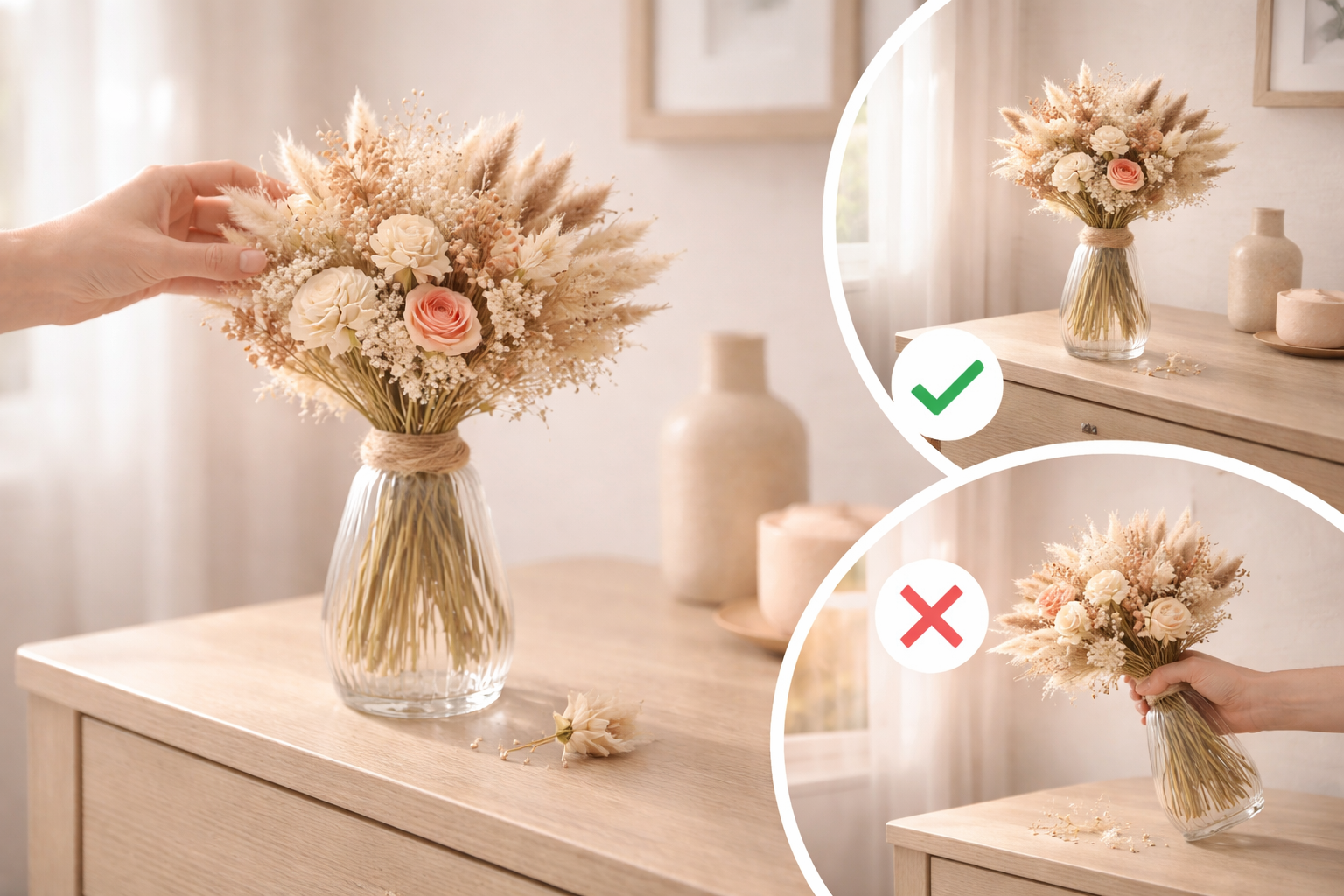Les fleurs séchées sont plus fragiles que les fleurs fraîches. Évitez les manipulations fréquentes afin de préserver leur structure.